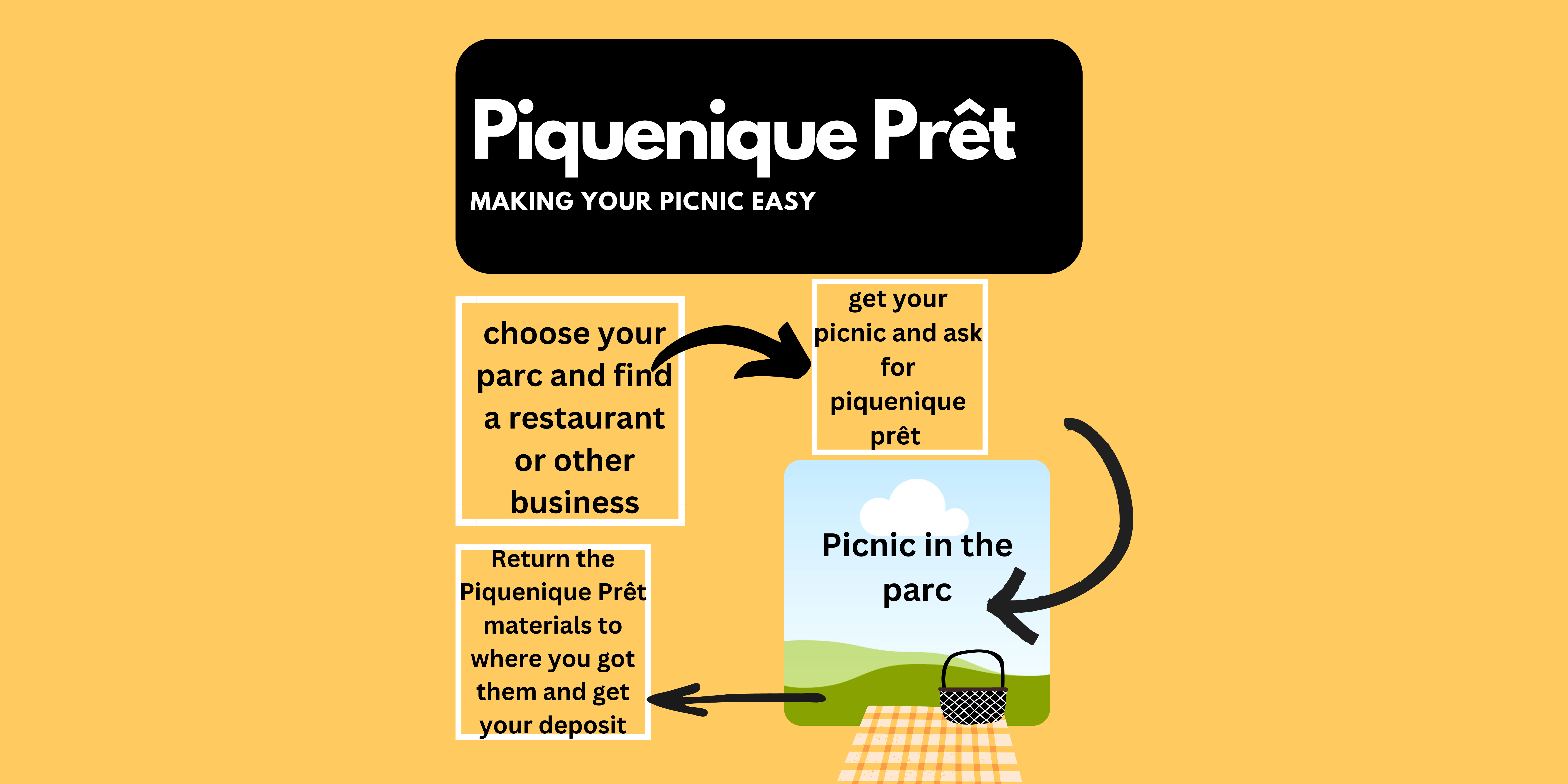 J’adore les pique-niques, mais il y a eu quelque moments où je n’ai pas eu le temps d’en préparer un, ou j’ai réalisé au dernier moment (alors que j’étais déjà près du parc) que je voulais faire un pique-nique spontenaié. Quelque fois, aussi, même quand c’etait planifié, où je préférais ne pas transporter toutes mes affaires de pique-nique avant et aprês. Alors, j’ai décidé de créer un service, ce service, pour combler ce besoin.